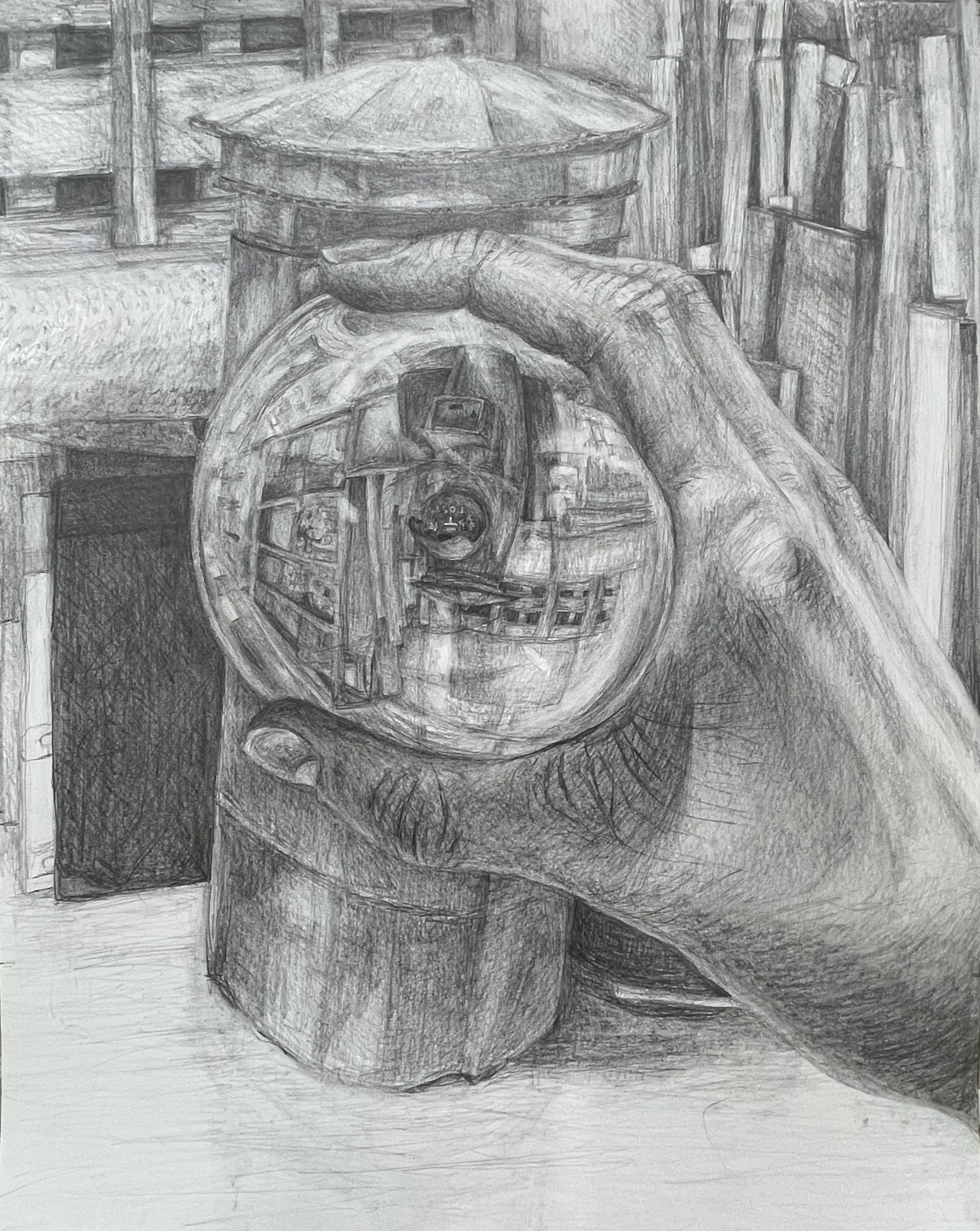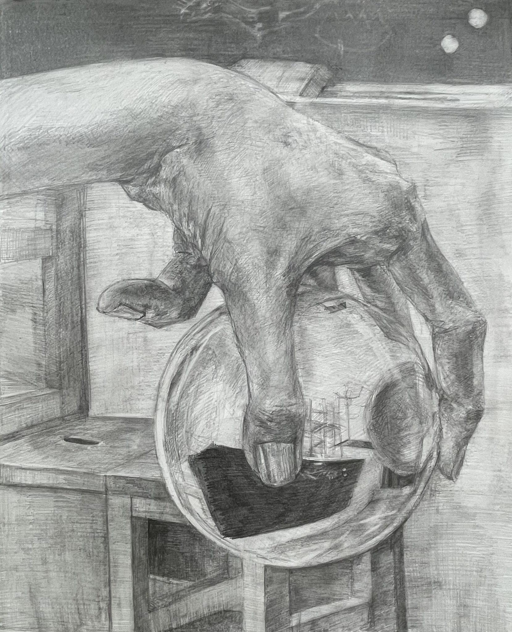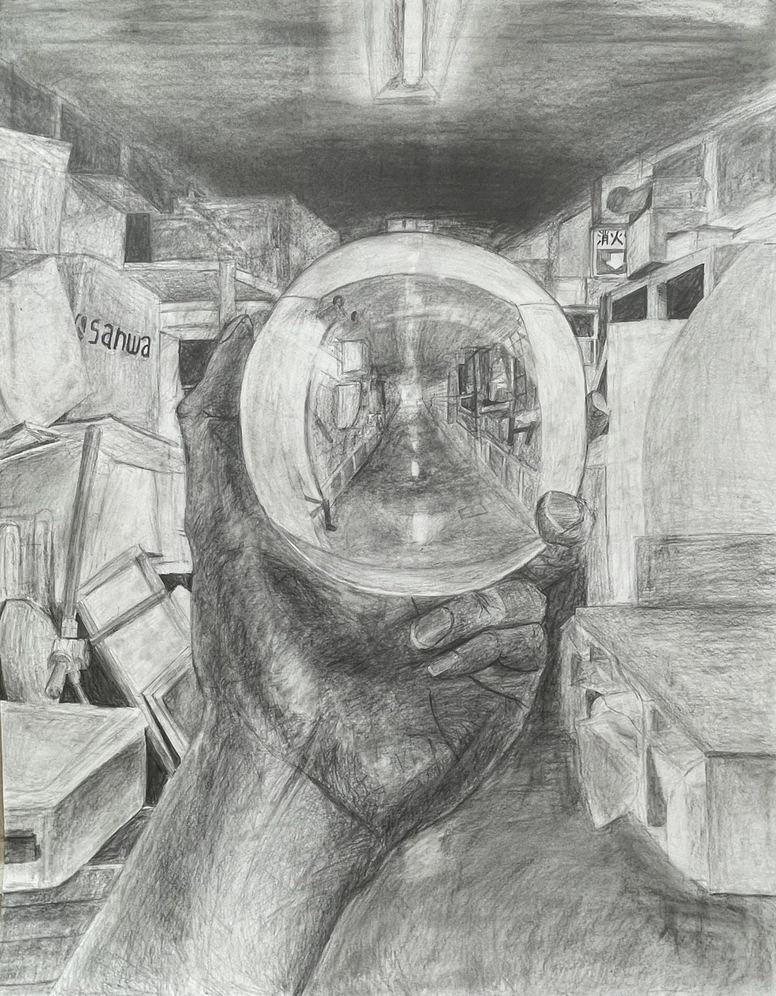 今回は構成デッサンでお題は「ガラス玉と手と室内風景を描きなさい」というもの。