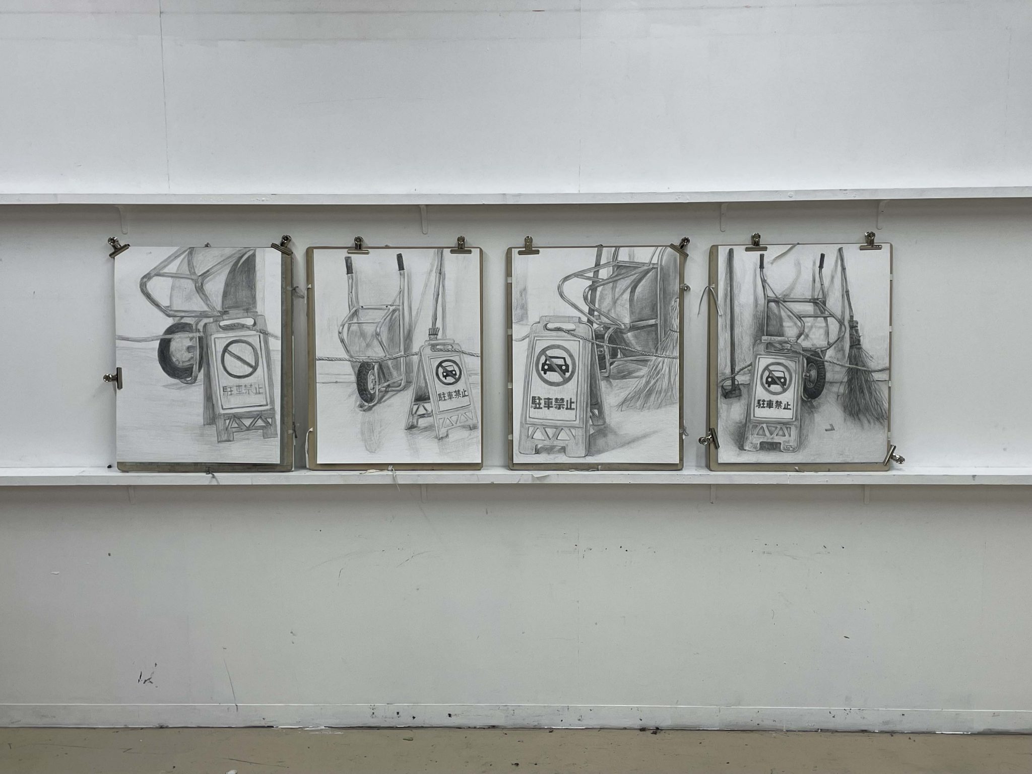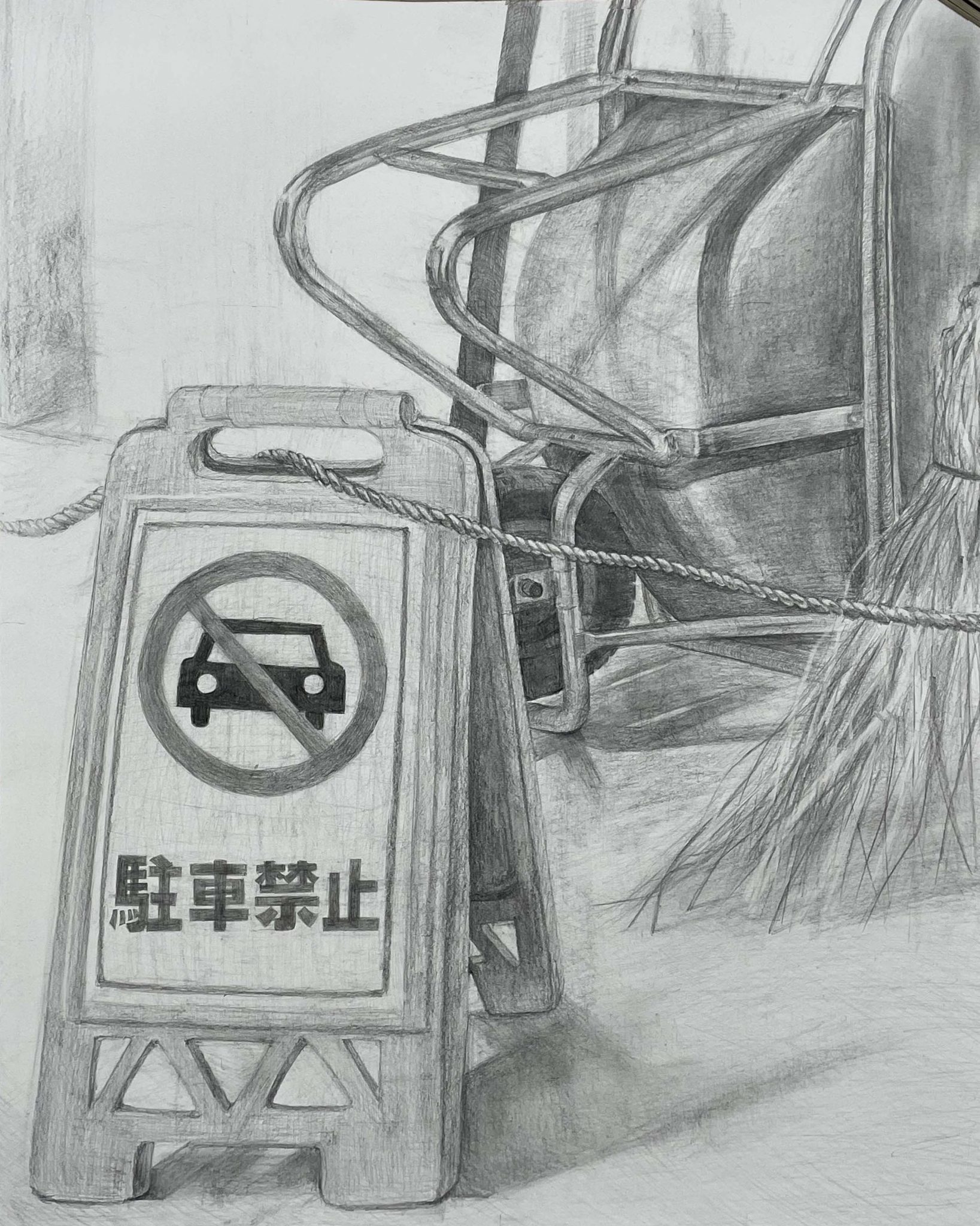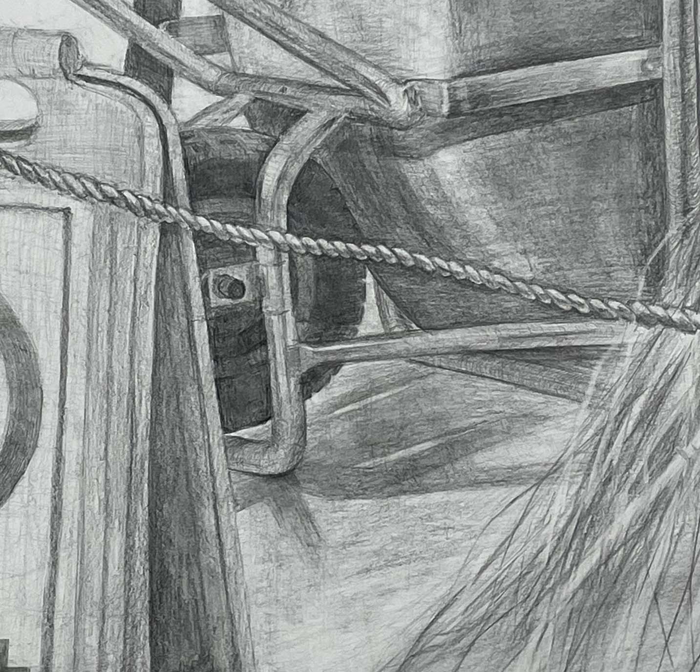 ちょっと拡大しますが、このあたりすごく良いですねー。よーく観察していて、タイヤと金属のパイプ、それに床の関係がとても丁寧に描かれています。