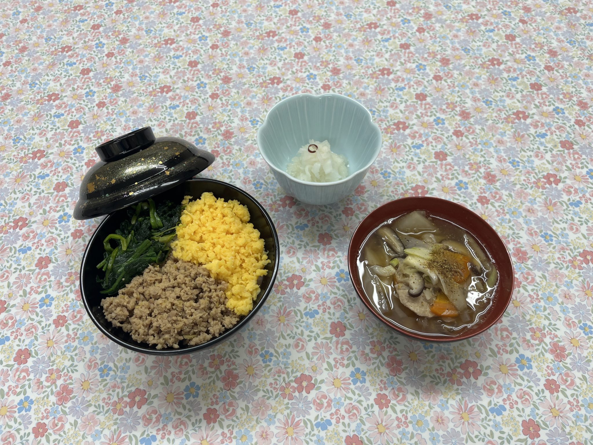 三色丼(鶏そぼろ・ほうれん草のソテー・炒り卵)