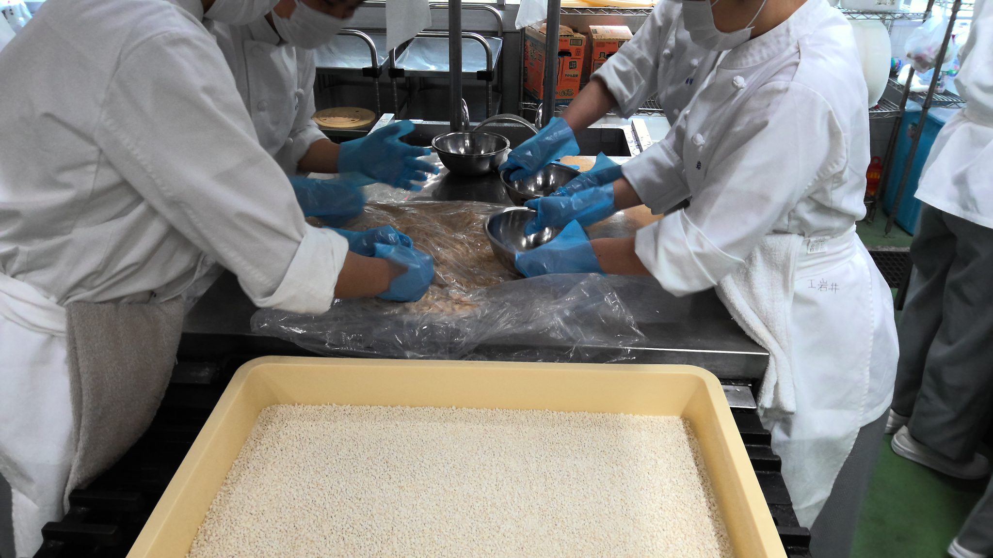 今年も毎年恒例「味噌の寒仕込み」を行いました。前々日から大豆を水に浸し、大きく膨れた大豆を前日に長時間煮ておきます。味噌作りの実習当日は、その豆をしっかりと潰すところからスタートします。