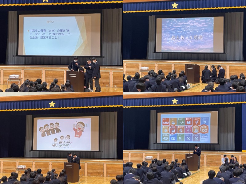 本日、企業インターンワークのまとめとして、各クラス代表グループによるプレゼンを行いました。1年間の授業の集大成として探究活動を行うことができました。