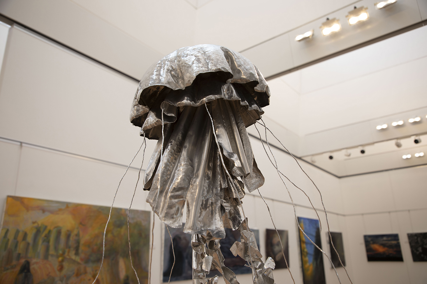 いろいろな素材を使っています。これはアルミニュウムをたたいて作っています。鍛金という技法です。
