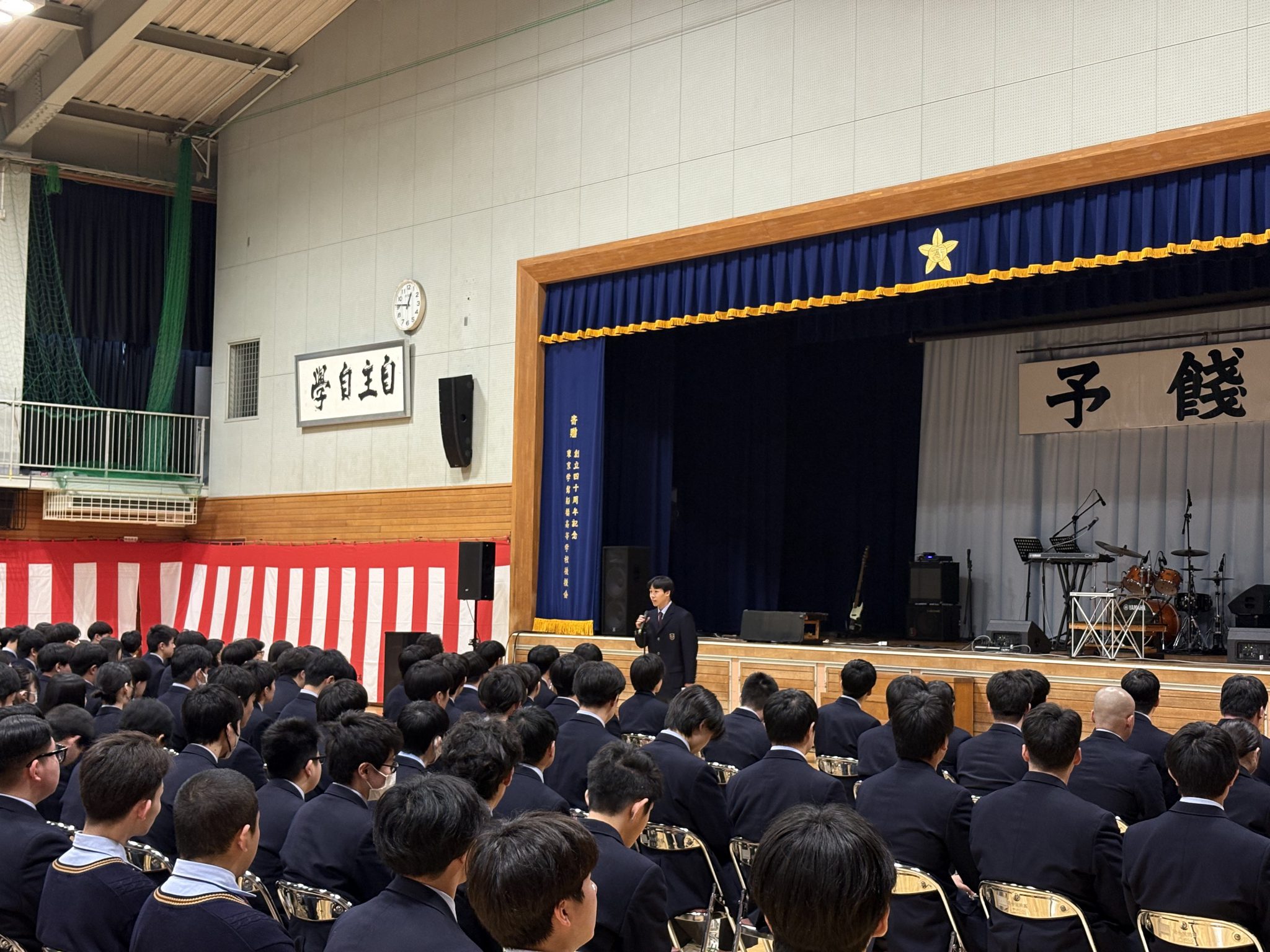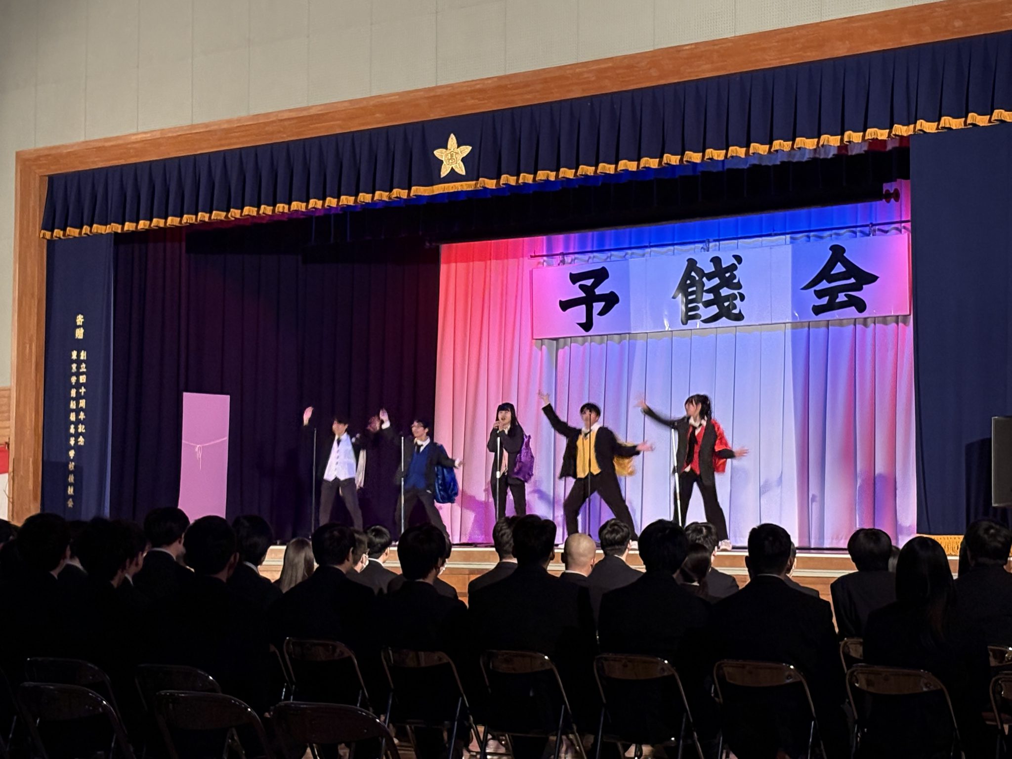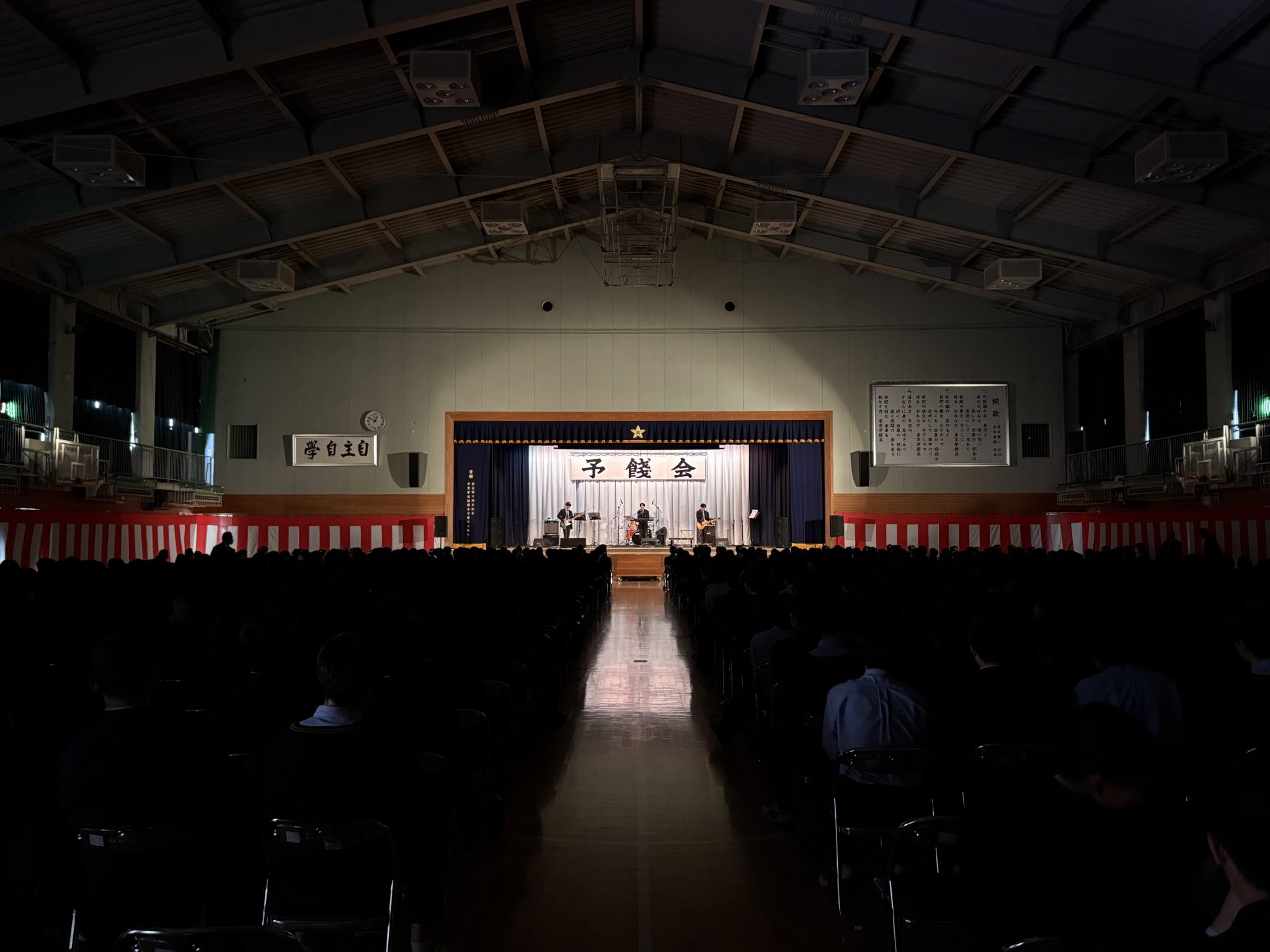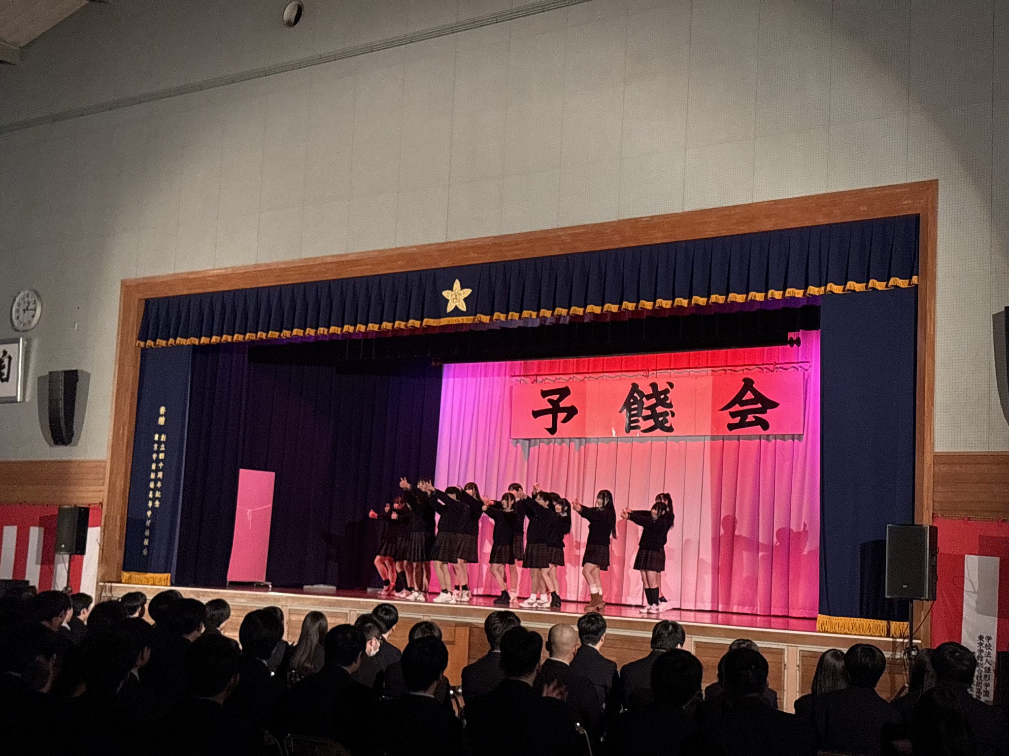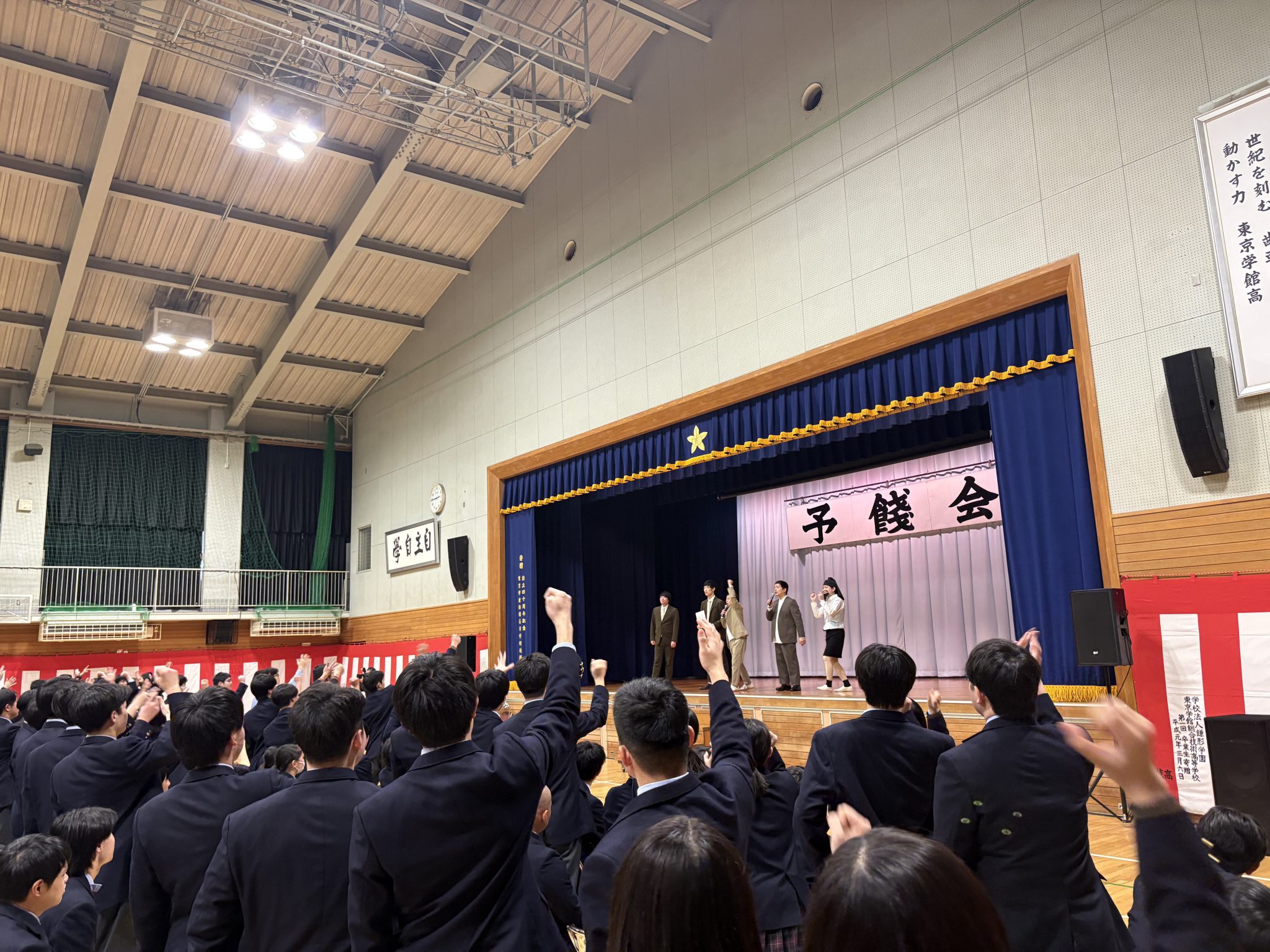 2026年02月27日(金) 学校全体 予餞会 令和7年度 予餞会 2月27日(金)予餞会が行われました。 軽音楽部、ダンス部が卒業生のために演奏や演技を行い、3年生の卒業を祝うとともに、お世話になった感謝を伝えることができました。 また、株式会社タイタンからウエストランドさん、脳みそ夫さん、まんじゅう大帝国さんがお越しくださいました。ネタ・漫才の披露と、じゃんけん大会が行われ、会場を盛り上げてくださいました。