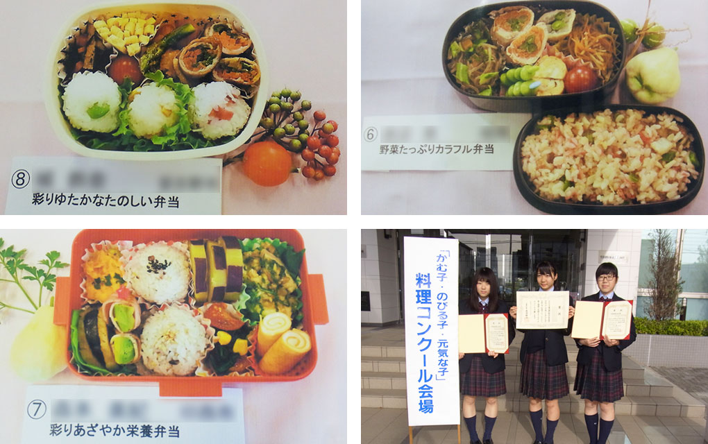 2年次にかむ子・のびる子・元気な子 料理コンクールに全員が応募しています。そして、毎年食物調理科の生徒が上位受賞しています。その他、「うまいもん甲子園」など、たくさんのコンテストにも挑戦しています。第12回「ご当地!絶品うまいもん甲子園」では、本校生徒が関東甲信越エリア選抜大会に出場しました。